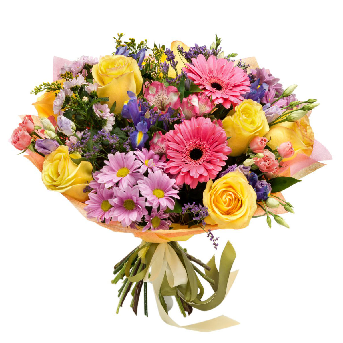 Хризантема кустовая, гербера, роза одноголовая, ирисы, статица, альстромерия, роза кустовая.