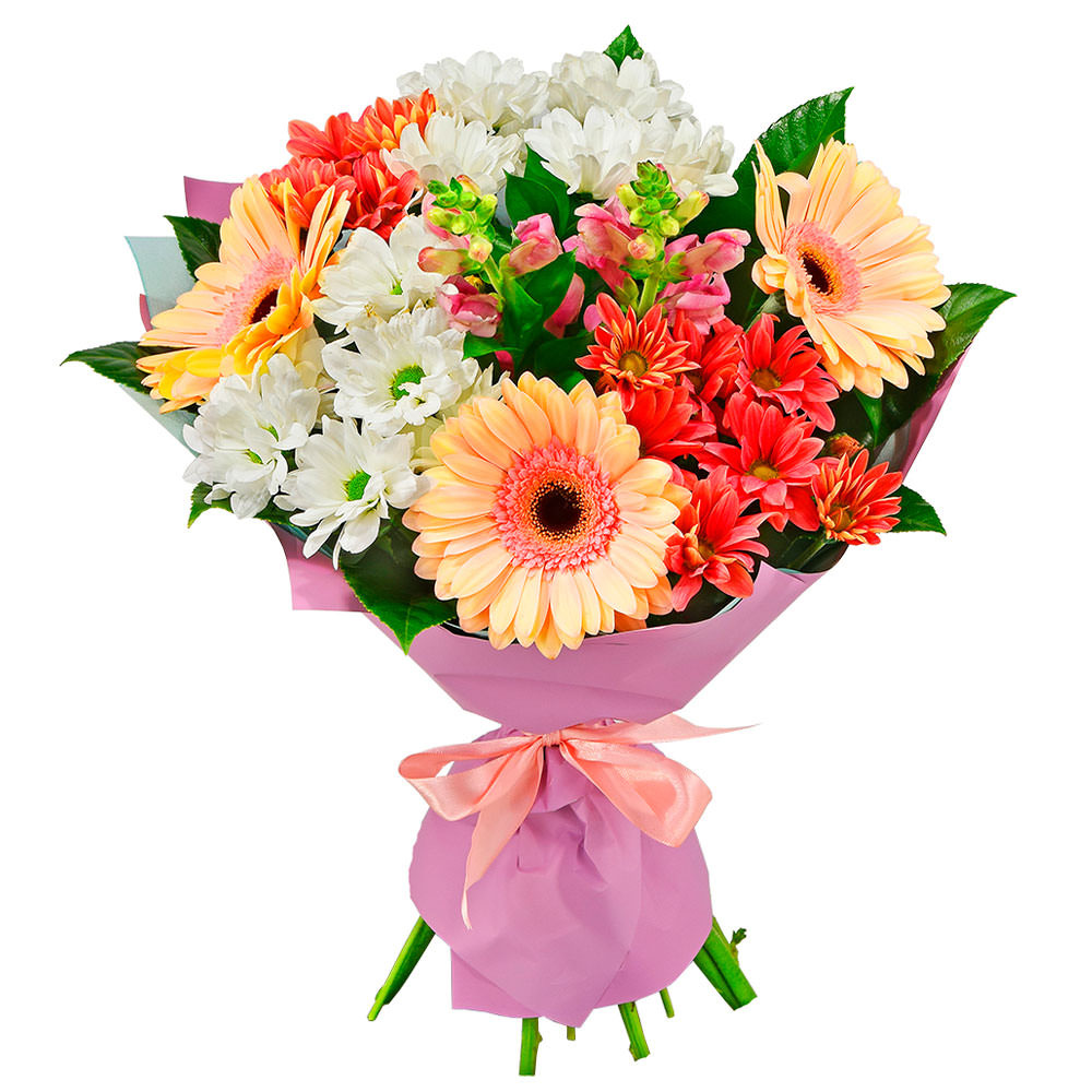 Гербера, хризантема кустовая микс, маттиола, зелень.