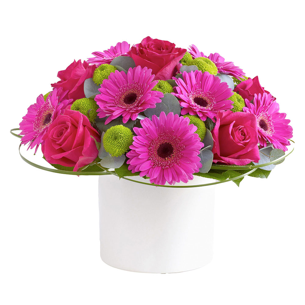 Гербера, роза, хризантема кустовая, эвкалипт.